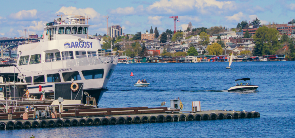 The boarding gate is located at the south end of the AGC parking lot near the fence that borders Kenmore Air. You’ll see an Argosy Cruises banner at the top of the parking lot and a ticket trailer near the dock at the bottom of the parking lot.