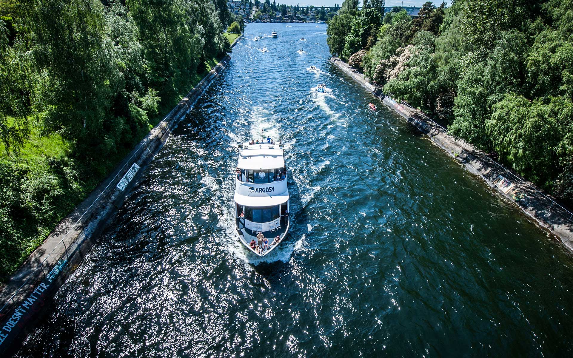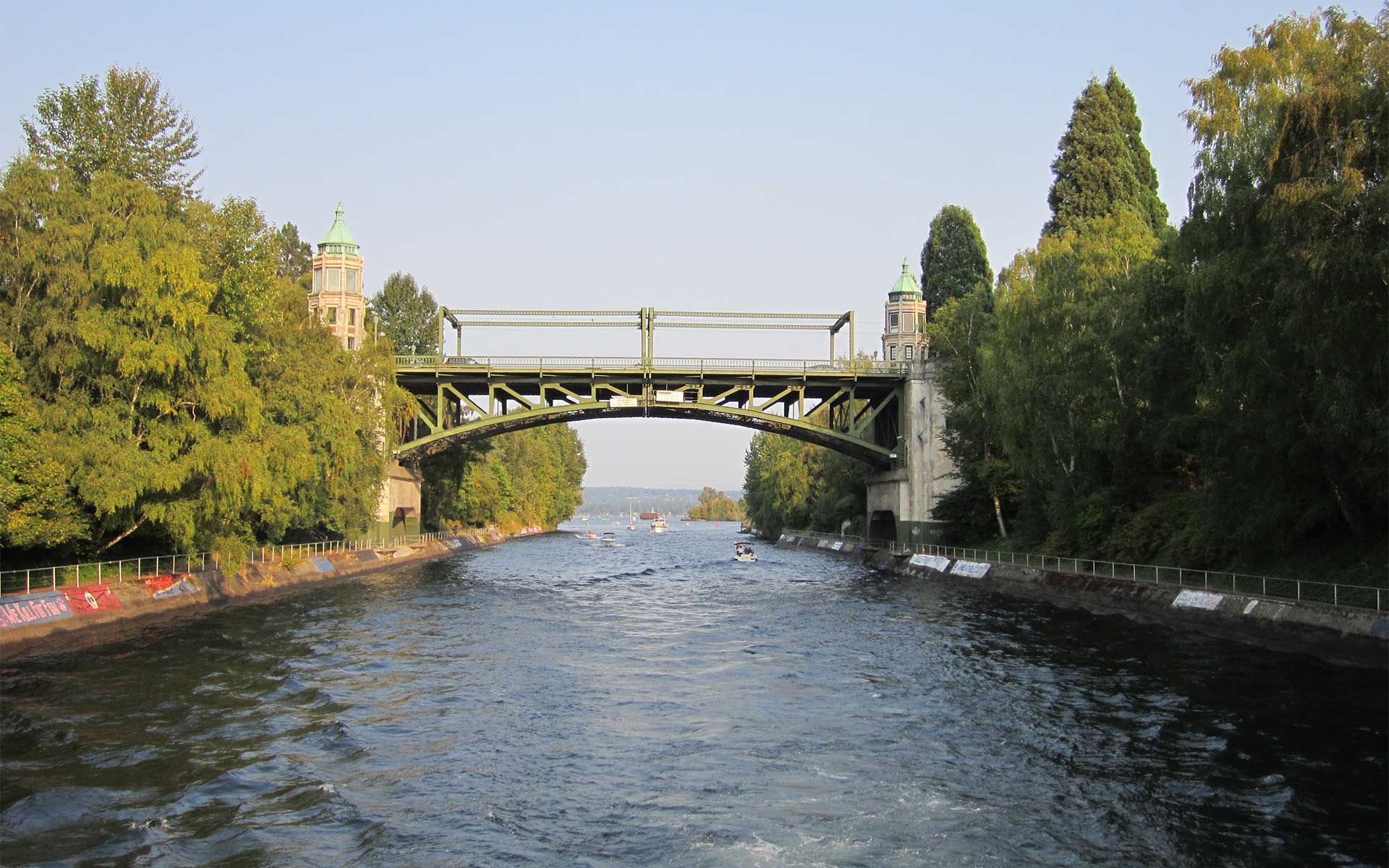 Man-made channel built to connect Lake Union and Lake Washington, completed in 1917. Concrete support walls become covered with graffiti each spring to cheer on crew teams rowing in the Windermere Cup races head in the Cut every first Saturday in May (Opening Day).